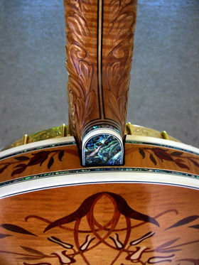 The back view showing the heel carving, the abalone heel cap and the marquetry.
