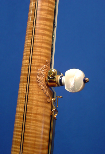 The carving at the fifth peg. All the carvings on the banjo were done so that they are above the level of the background.