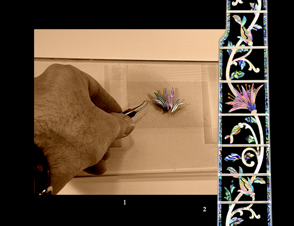 The flower as it appears after it was inlayed into the ebony fingerboard.