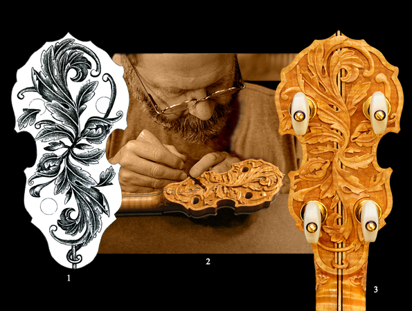 The paper pattern shows what the carving will look like when it is completed. The paper design was attached to the surface of the wood with spray adhesive and the paper was carved through using the same process as with the heel carving.