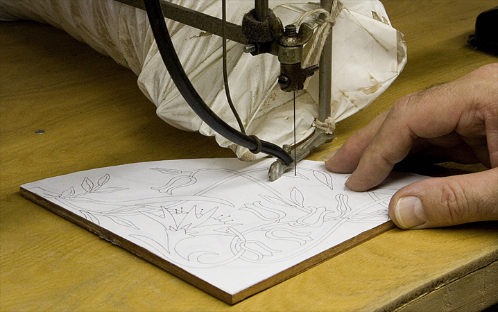 The maple veneer background for the marquetry was divided into eight matching quarters – four for the back of the resonator and four for the inside of the resonator. The quarters were made into a “pad” of veneers and all eight were cut at the same time. All the stems and flower parts were also cut out eight at a time. The saw is powered by an old sewing machine. |