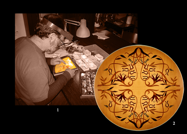 Shown above is one of the eight quarters when it was receiving its inlays. There are almost 800 pieces of wood marquetry inlay pieces so they were kept organized in small plastic boxes.
