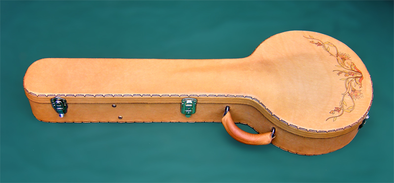 The case was made to match the banjo. A regular banjo case was used, covered with leather matching the maple color of the instrument, and the leather was decorated with a design that echoes the marquetry pattern. The stitching was done one stitch at a time using a foot-pedal-operated sewing apparatus that Dan made to help with the task of sewing through the tough leather. |